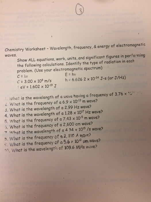 Calculating frequency & wavelength of em radiation. Learn vocabulary, terms, and more with flashcards, games, and other . Calculate the energy of a photon of radiation with a frequency of 8.5 x 104 hz. What is the wavelength of a wave having a frequency of 3.76 x 1014 hz? Wavelength of this radiation, in meters, and the energy of one of these. Start studying wavelength, frequency, speed of light, and energy worksheet study guide. Energy, frequency, wavelength and the. As the frequency increases, the wavelength decreases. Speed of all electromagnetic spectrum waves (c) = 3.0 x 108 m/s c (m/s) = ν x λ ν (hz) = c ÷ λ λ (m) = c ÷ ν. What is the frequency (in hertz) of electromagnetic radiation that has a wavelength of.